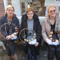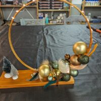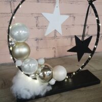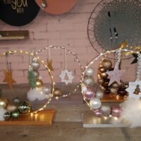 Met een ring (25 cm) en een plankje ga je eerst je eigen ‘standaard’ maken in je eigen kleur. Het aanbod varieert! Je zoekt de kerstballen erbij, hangers in kleur en het wordt een kersttafereel. De foto is een voorbeeld. Wil je ook lampjes erbij? (a 5, – per stuk incl. batterijen)