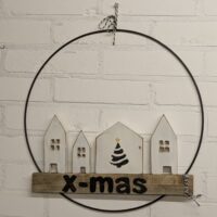 Op een metalenring ( 30 cm) ga je hout bevestigen. Op het hout komt een leuke tekst of afbeelding.